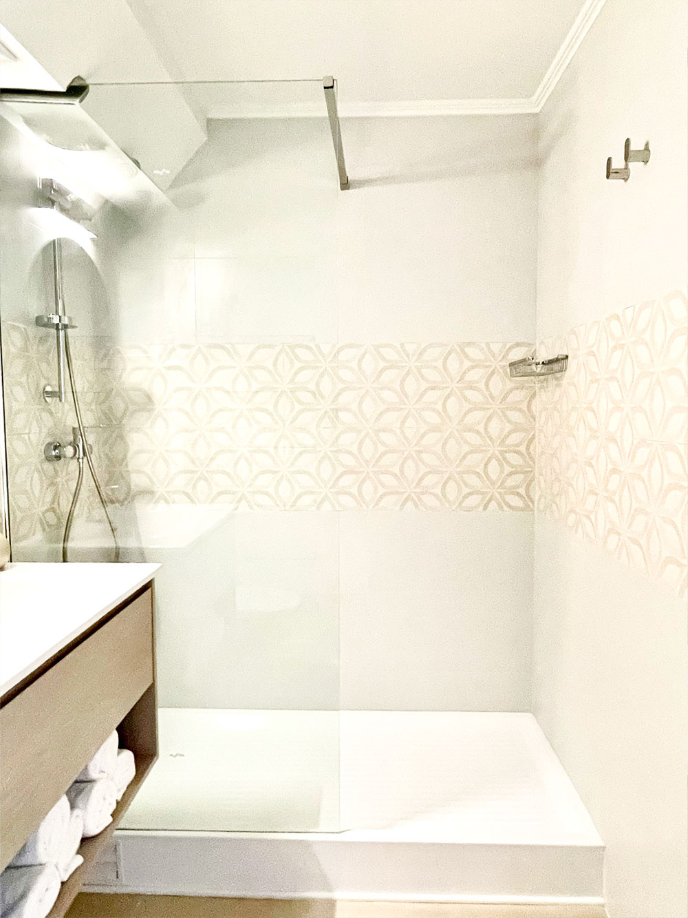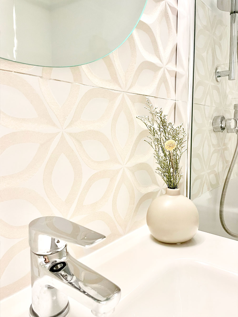 Nos decantamos por tonos blancos, tiza y beige, añadiendo sutiles toques de iluminación para enfatizar el diseño de los porcelanatos 3D y conferirles mayor protagonismo.